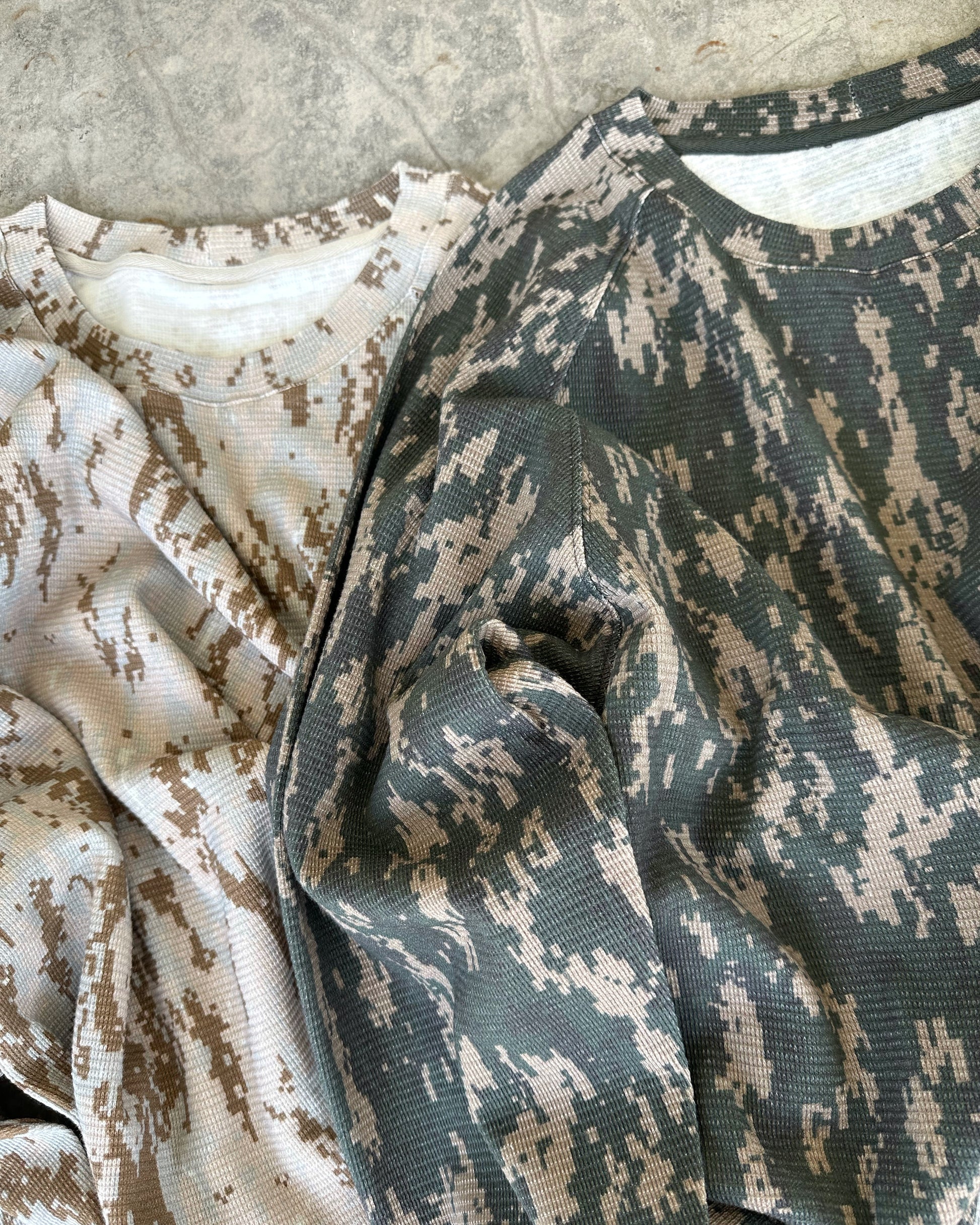 digital camo printed single sided thermal. made from pure 100% cotton. from sleeves to neck line. cropped boxy fit for the fashion forward oversized look.